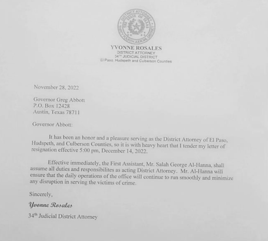 Karla Draksler On X Unsigned Resignation Letter From D A Yvonne Rosales Addressed To Governor Greg Abbott Rosales Agreed To Resign Dec 14 Https T Co Ib9rr1ngix X